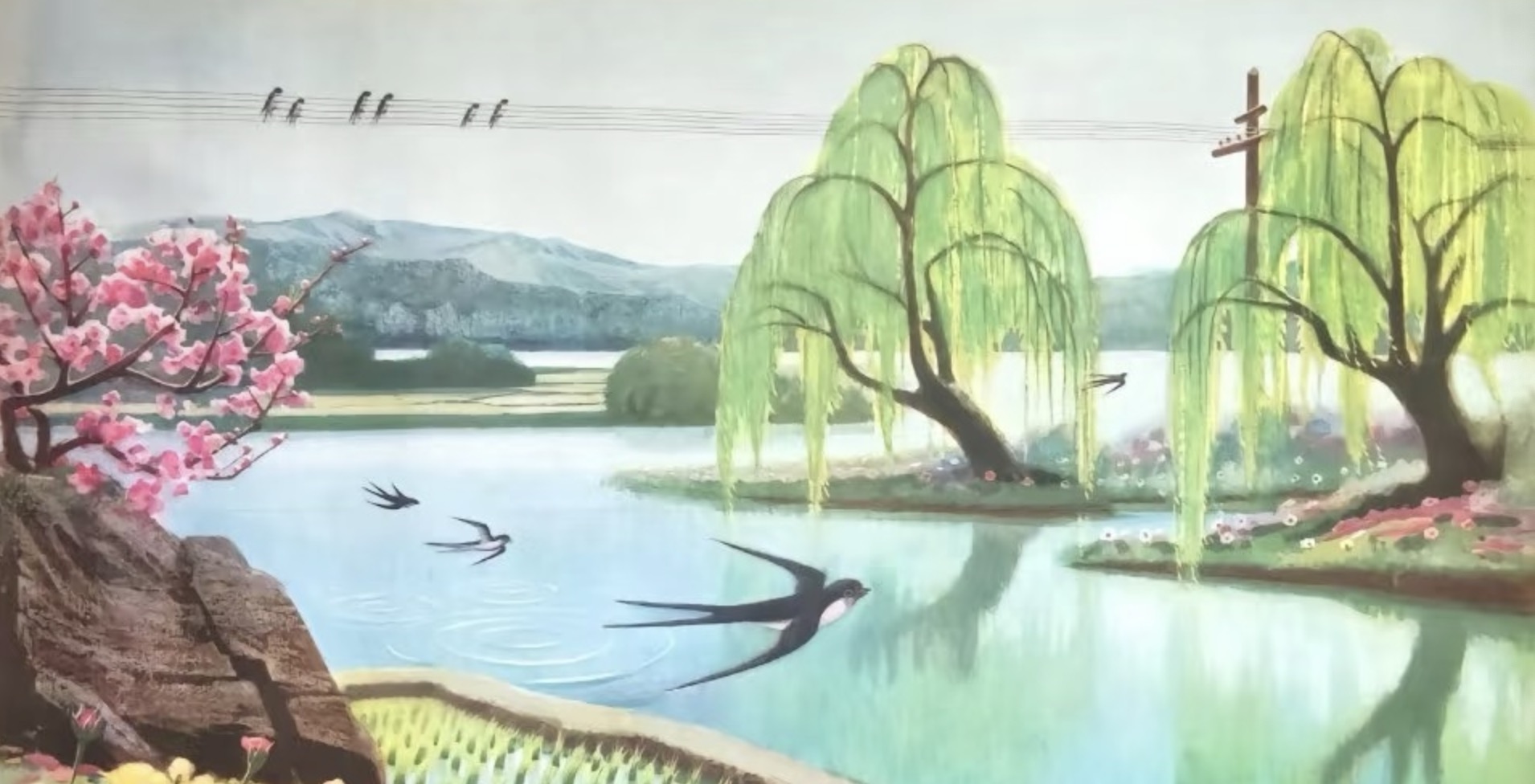 春雨足,染就一溪新绿。柳外飞来双羽玉,弄晴相对浴。