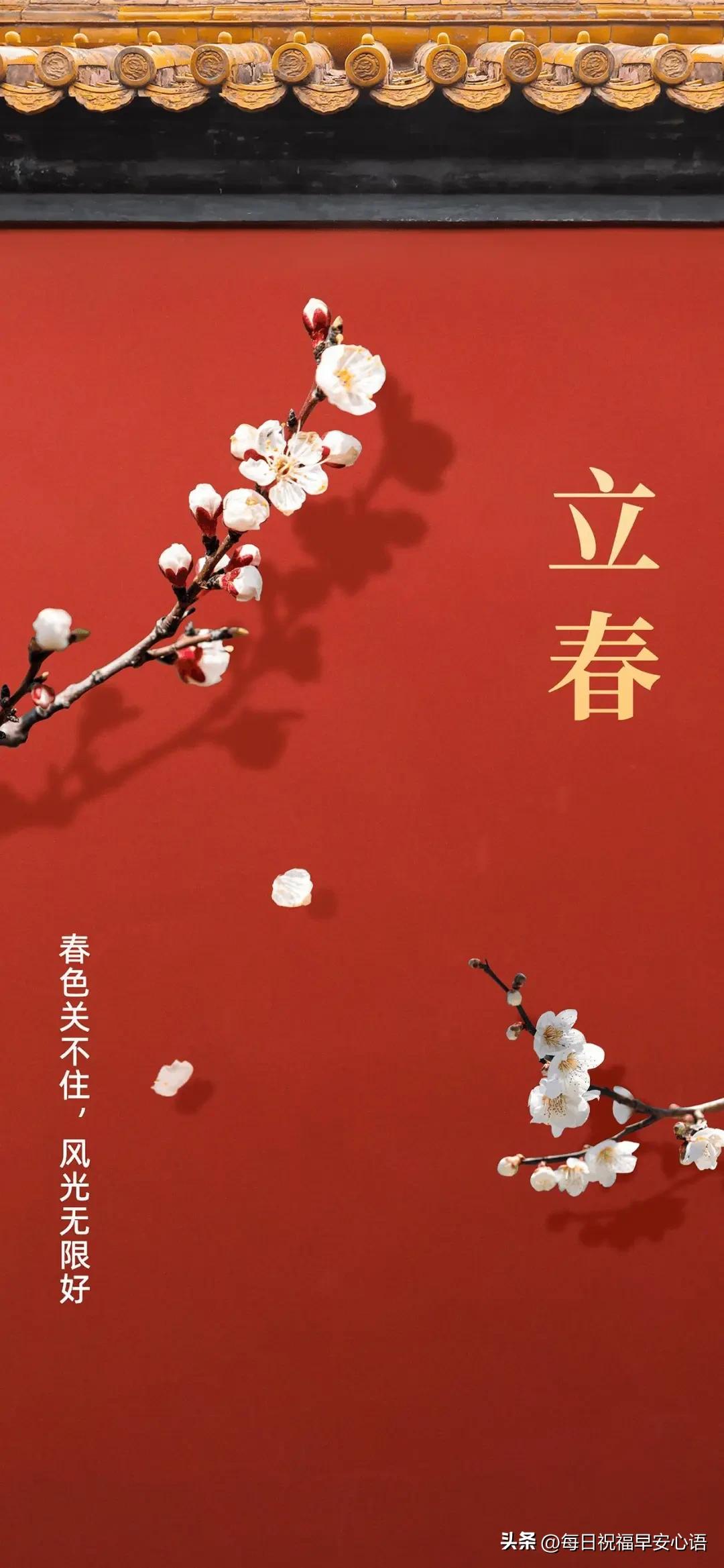 2、春来早,春在报,立春影子来报到;春来闹,春在叫,立春日子真美好;鼓勇气,要争气,立春的今天立大志;勤努力,要珍惜,立春的明天不放弃,立春时节,定新年之计,祝你事事如意!