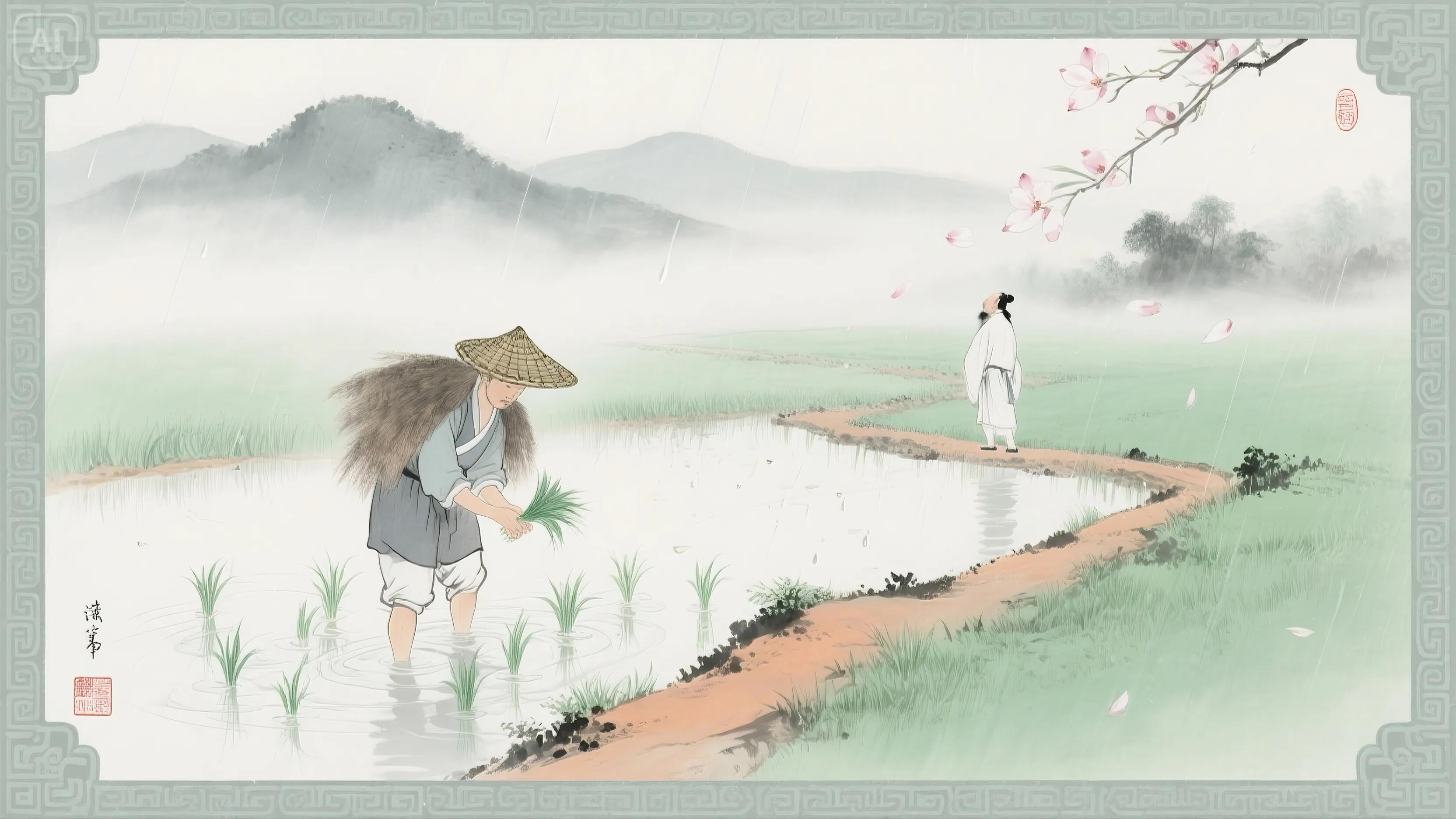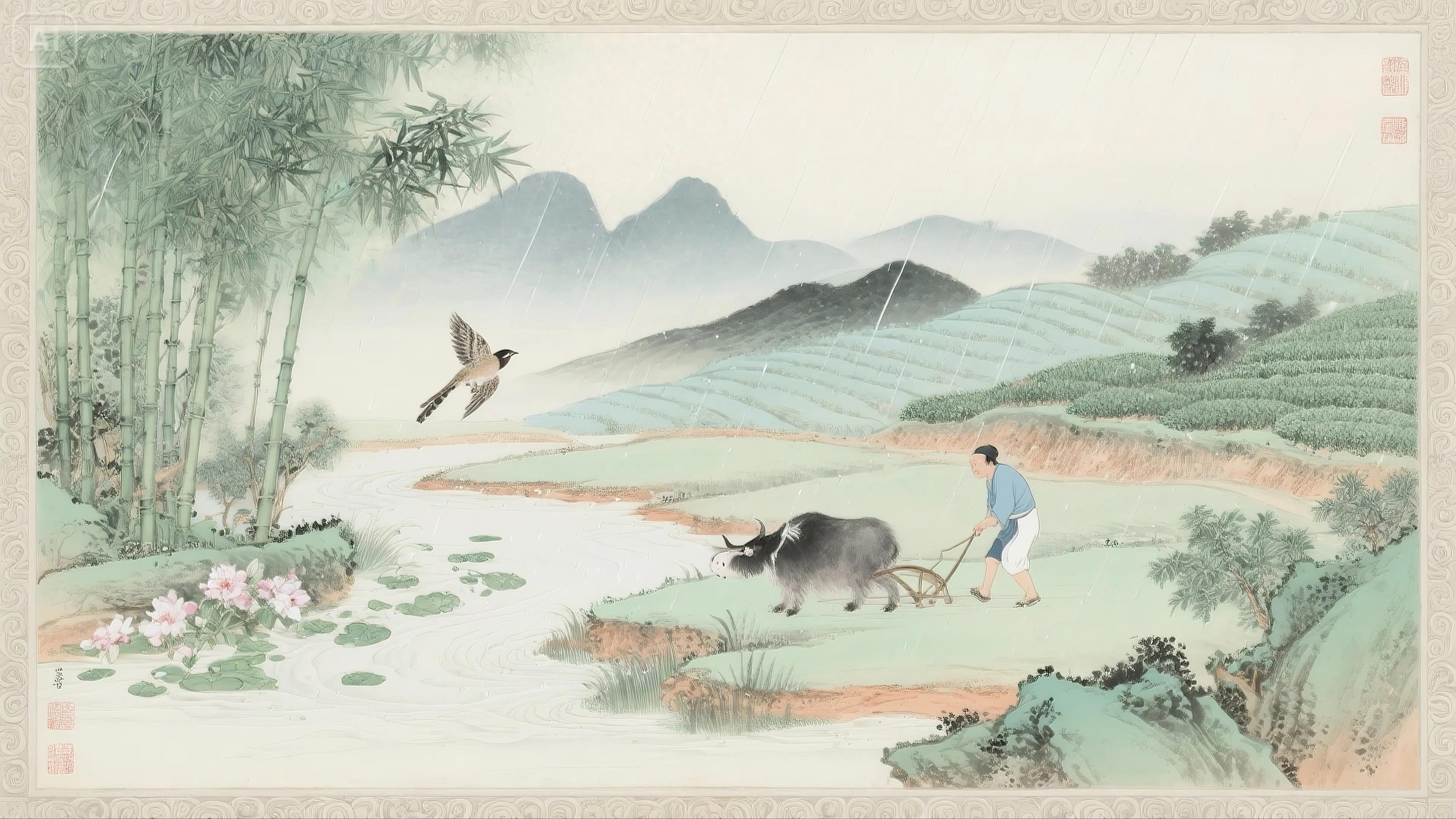 简析:江南谷雨农耕图,虚实结合,展现田园生活意趣。