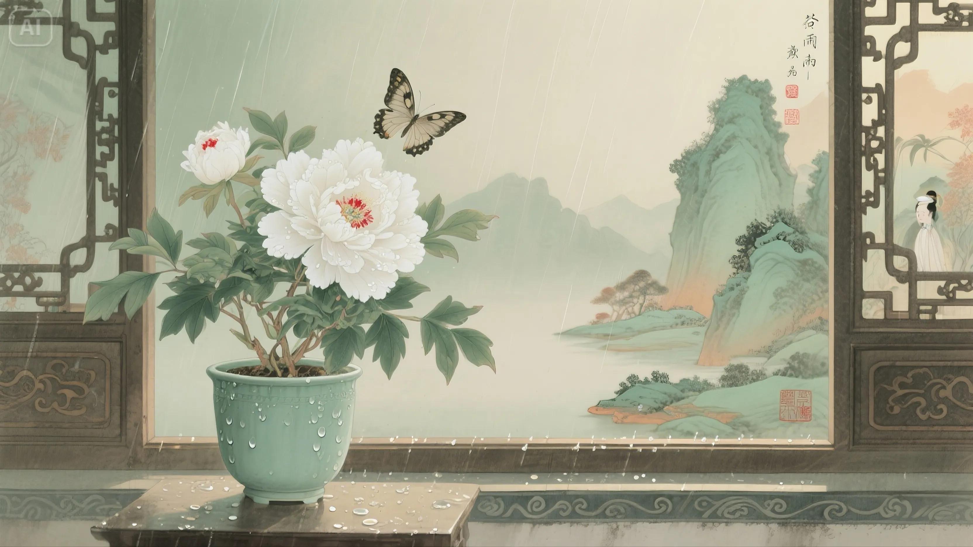 简析:以谷雨润泽喻白牡丹的纯净,暗含对高洁品格的赞颂。