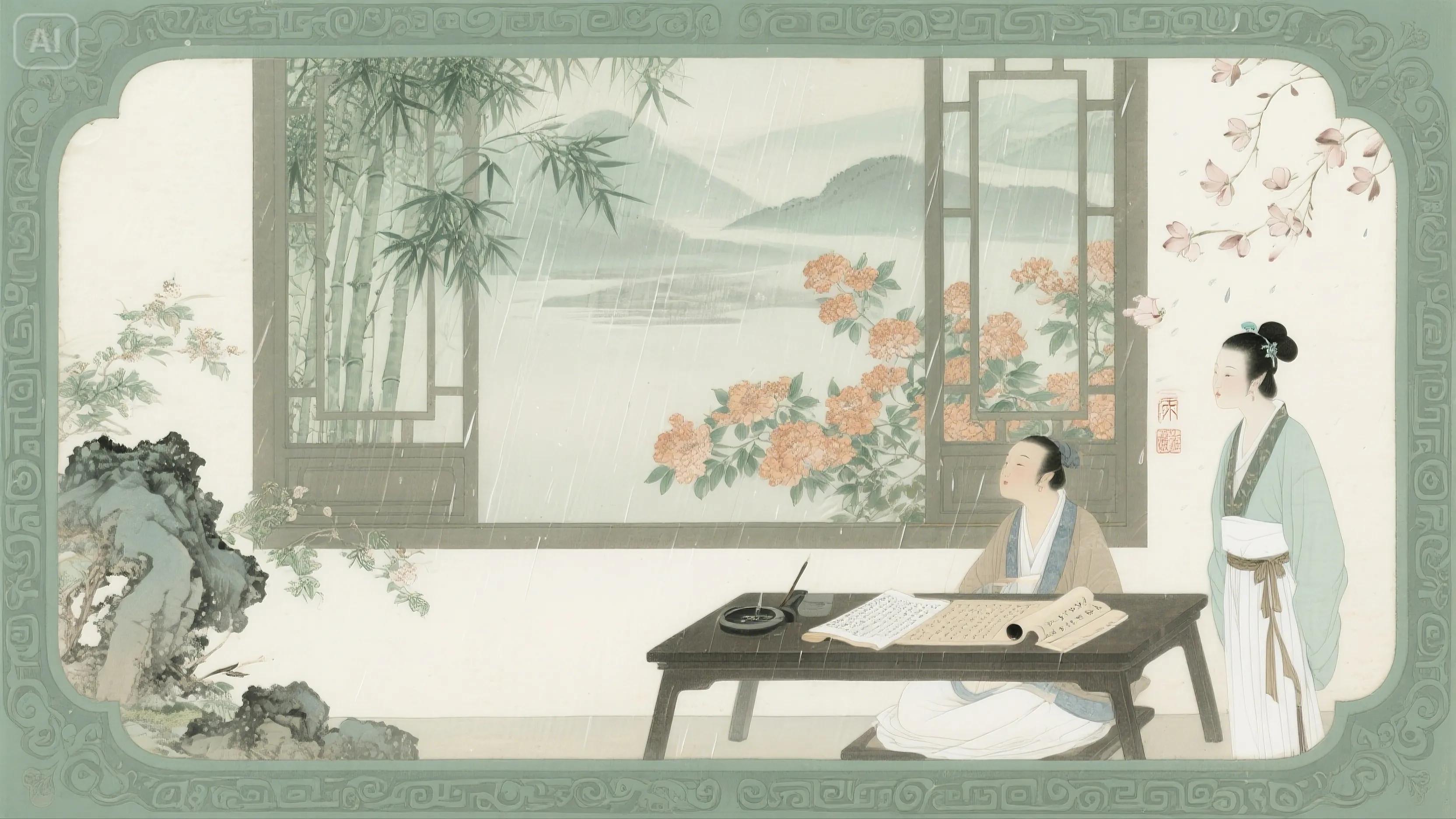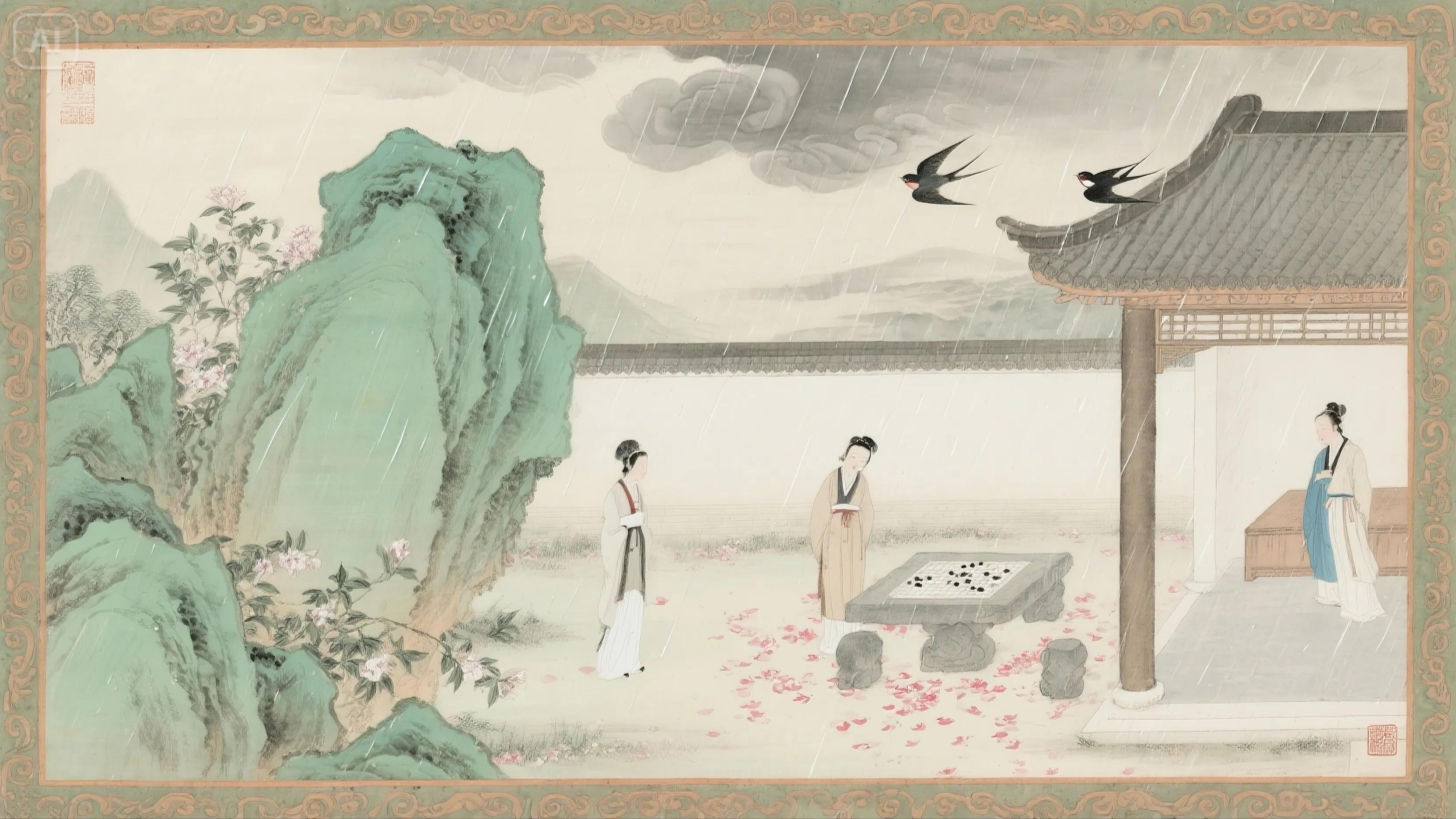 简析:闺阁谷雨日常,梳妆、洗砚、采茶,细节生动。